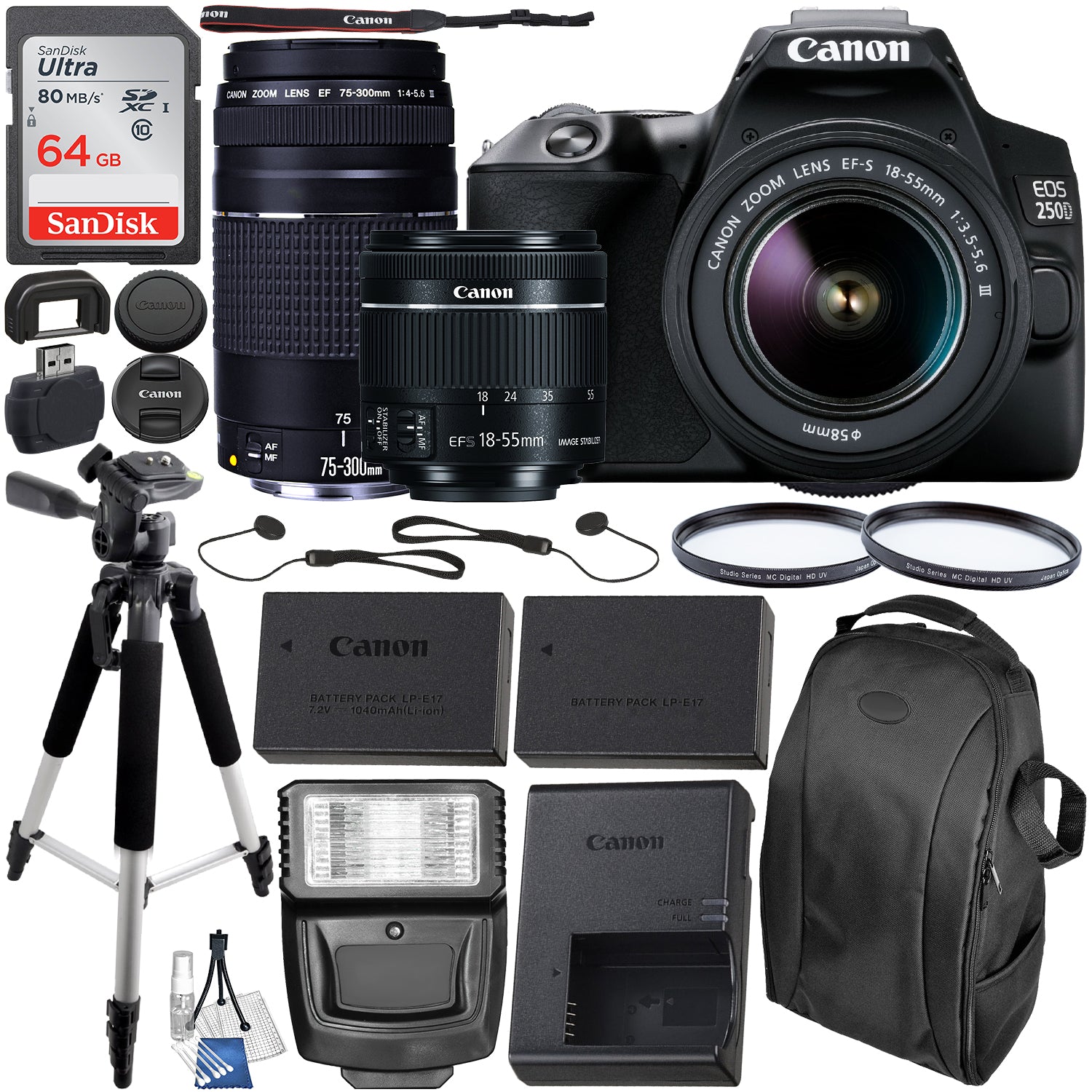Canon EOS 250D (Rebel SL3) DSLR Camera with 18-55mm & 75-300mm Canon Lenses & Essential Accessory Bundle – Includes: SanDisk Ultra 64GB SDXC Memory Card, Extended Life Spare Battery & MORE