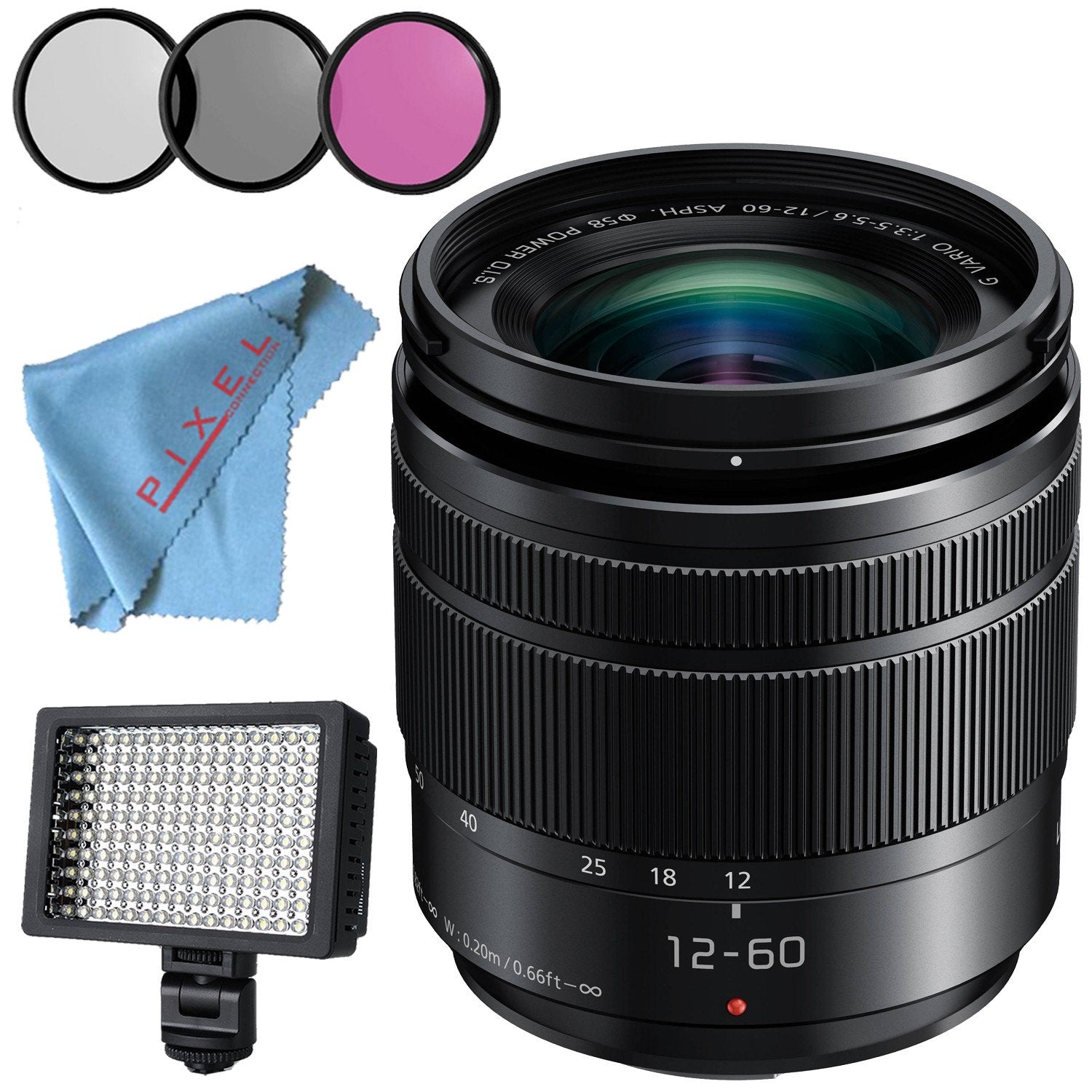 Panasonic Lumix G Vario H-FS12060 12-60mm f/3.5-5.6 ASPH. Power O.I.S. Lens + 58mm 3 Piece Filter Kit + Professional 160 LED Video Light Studio Series + Fibercloth Bundle