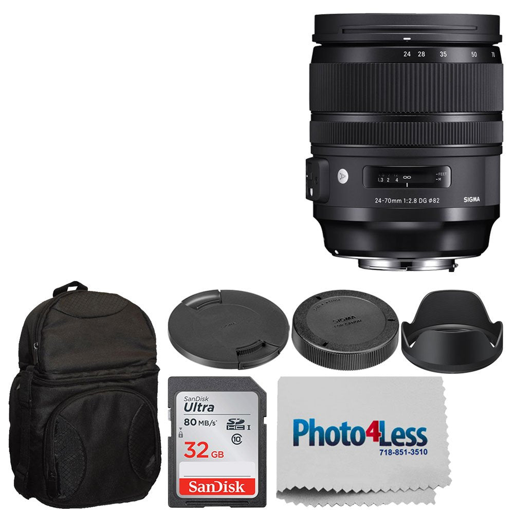 Sigma 24-70mm f/2.8 DG OS HSM Art Lens for Nikon F (576955) + Deluxe Digital Camera/Lens Padded Backpack + 32GB Memory Card + Photo4Less Cleaning Cloth - Top Value Basic Lens Accessory Bundle