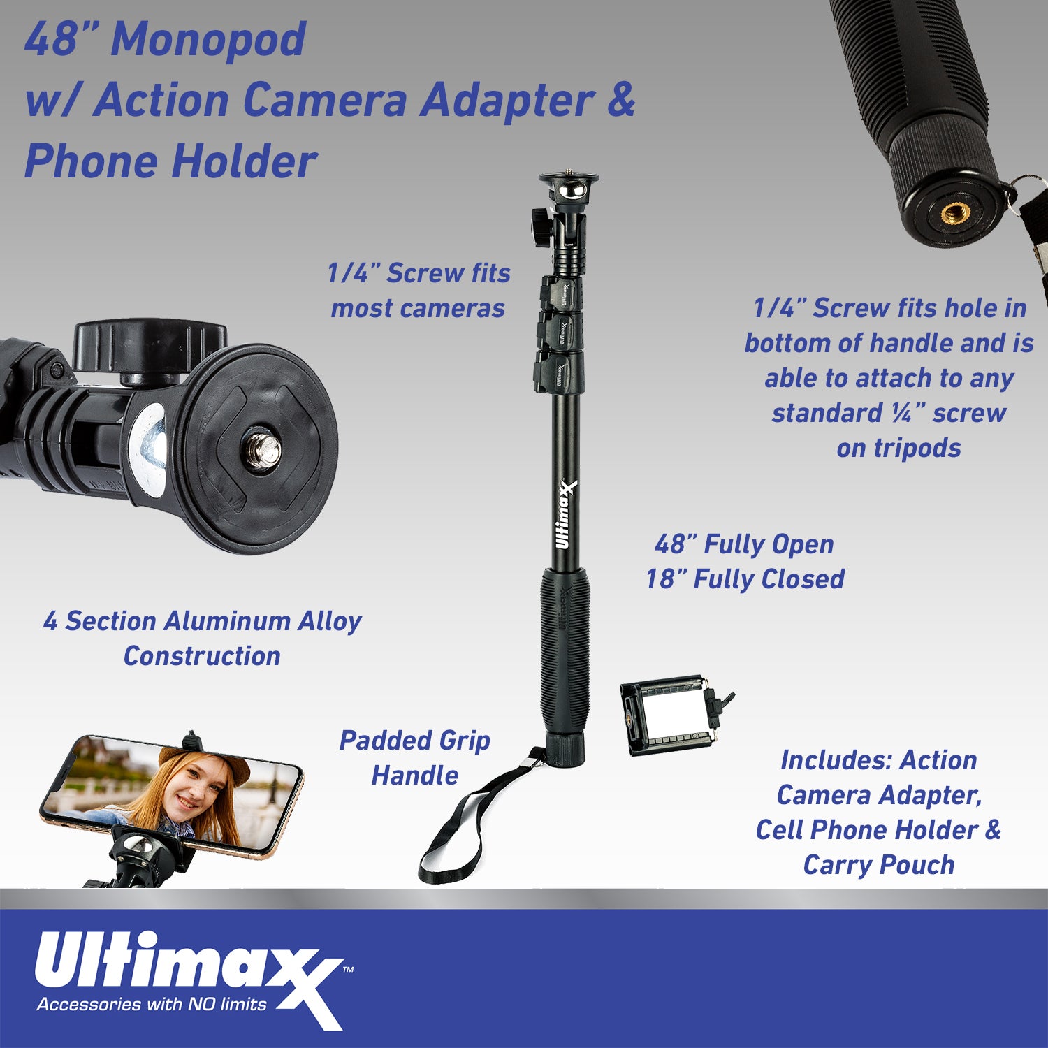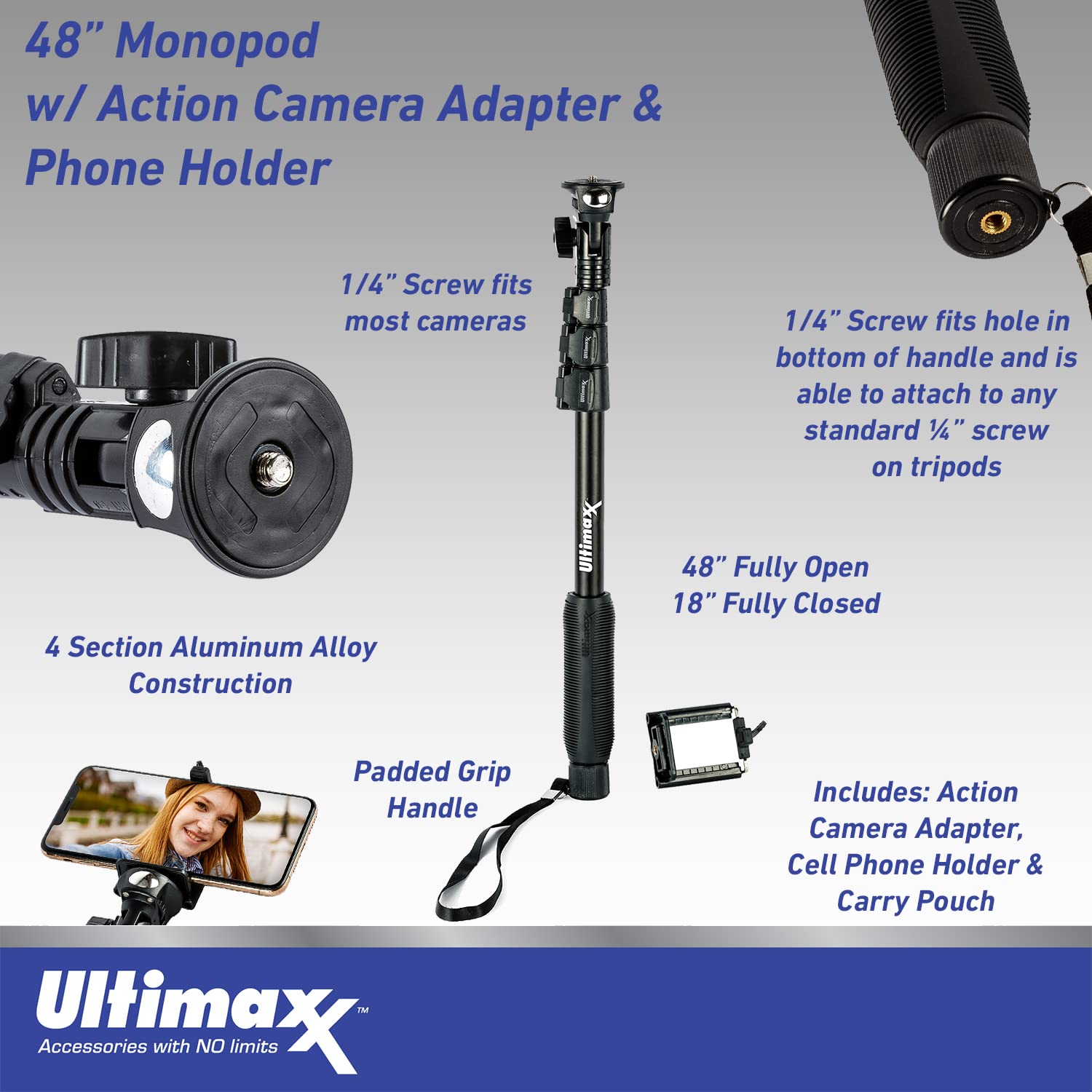 - Ultimaxx 48" Monopod / Selfie Stick with Adapter for GoPro / Go-Pro / Action Camera